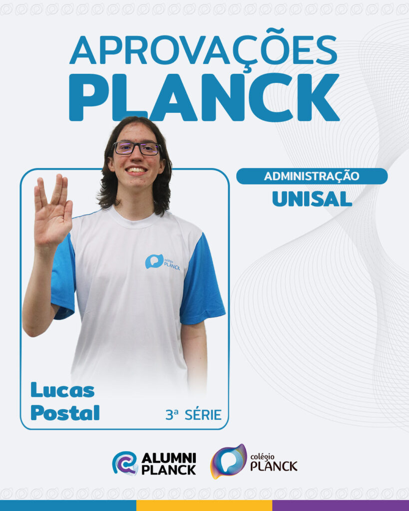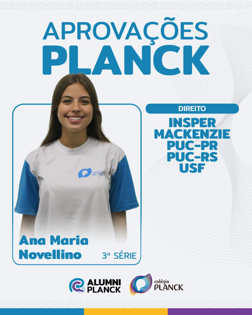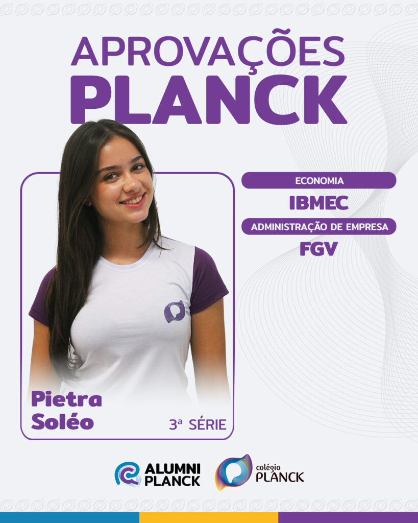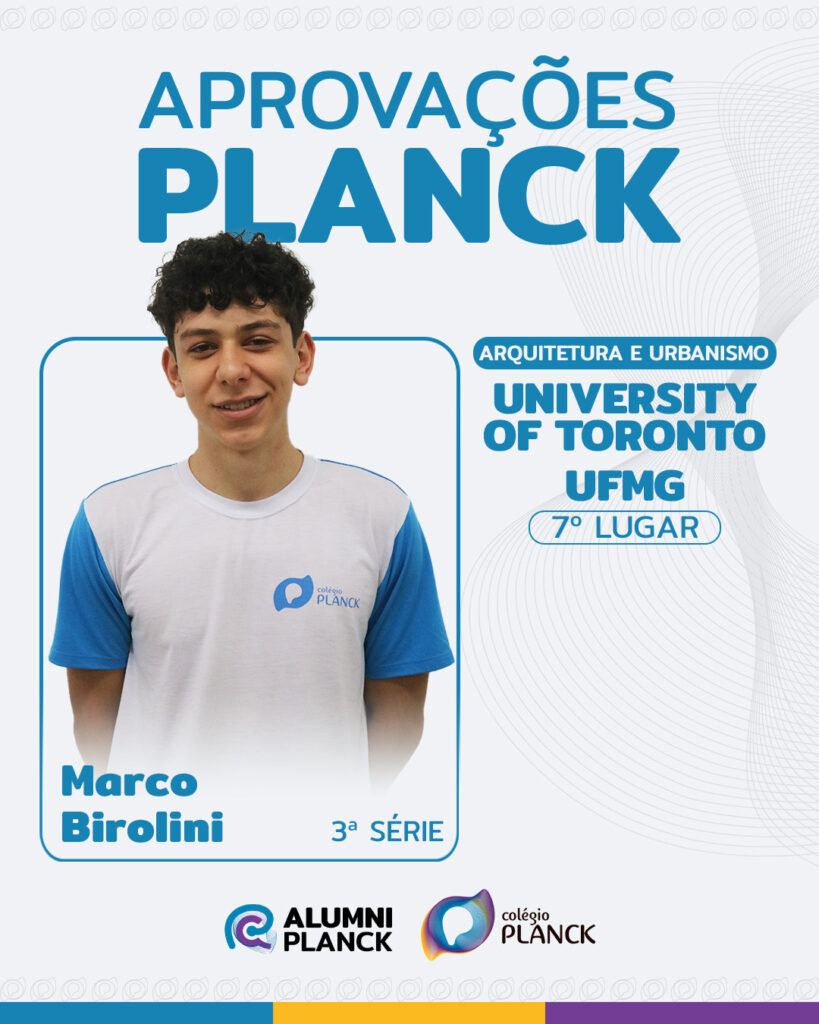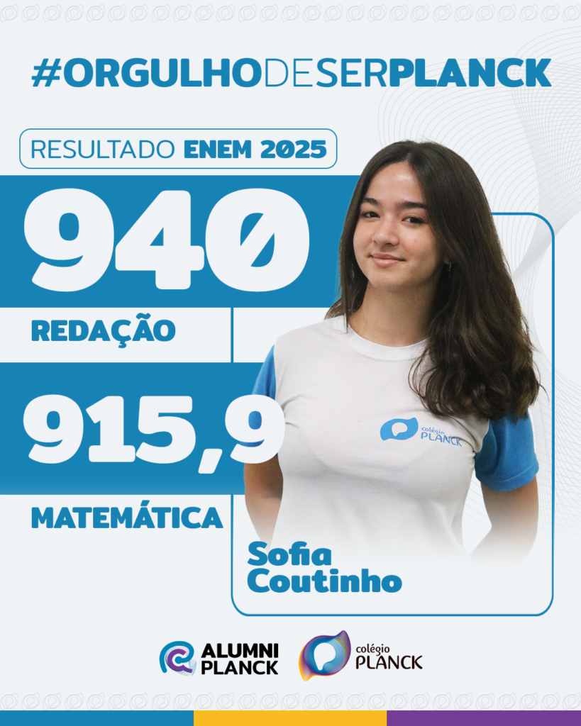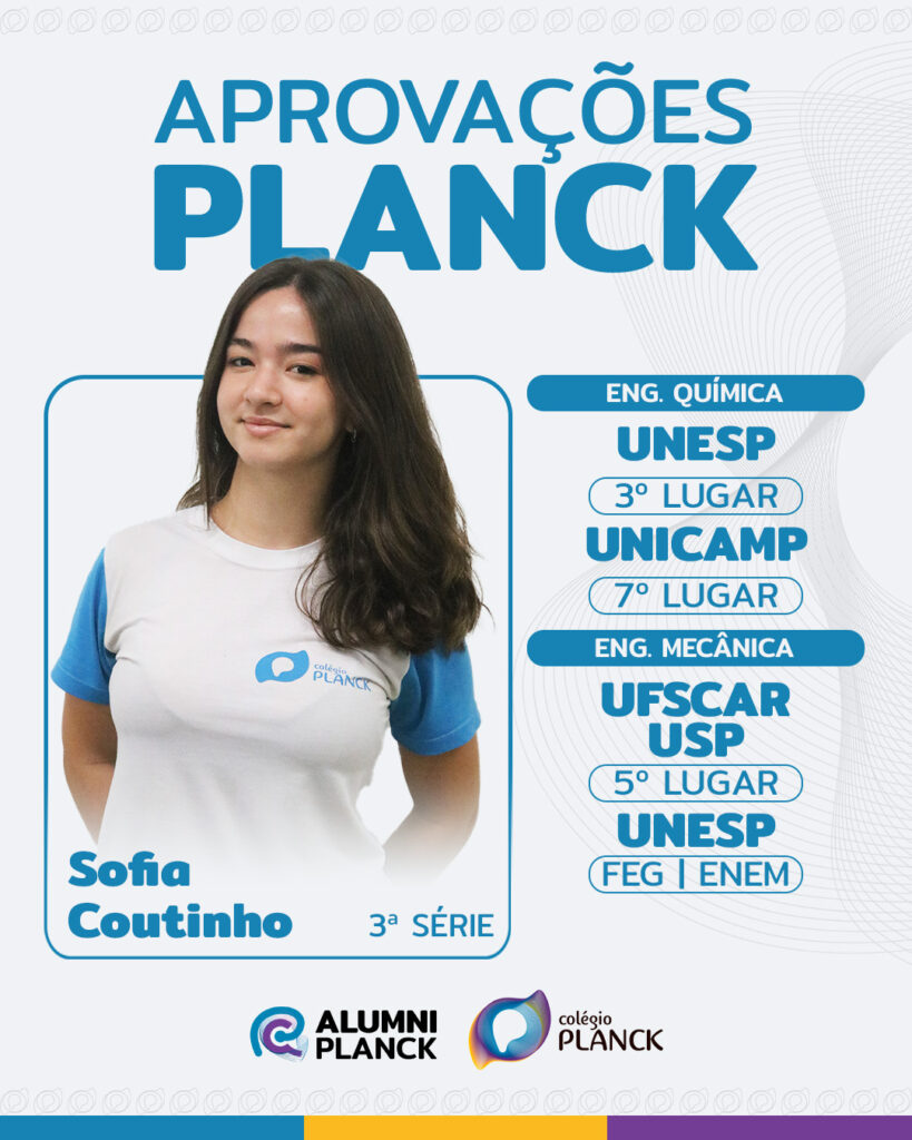 O Colégio Planck se destaca ano após ano pelos excelentes resultados em vestibulares e universidades renomadas. Nossos alunos conquistam aprovações em instituições públicas e privadas de alto nível, reflexo de um projeto pedagógico sólido, professores altamente qualificados e uma cultura de alto desempenho acadêmico. Cada aprovação representa o compromisso do Planck com a formação integral e o futuro dos seus estudantes.