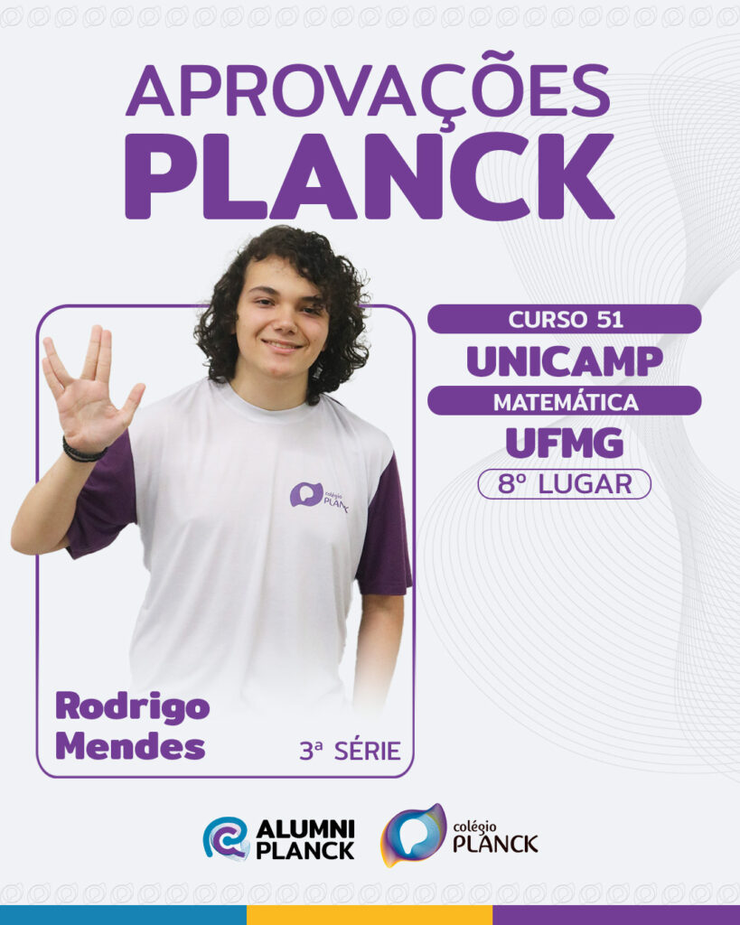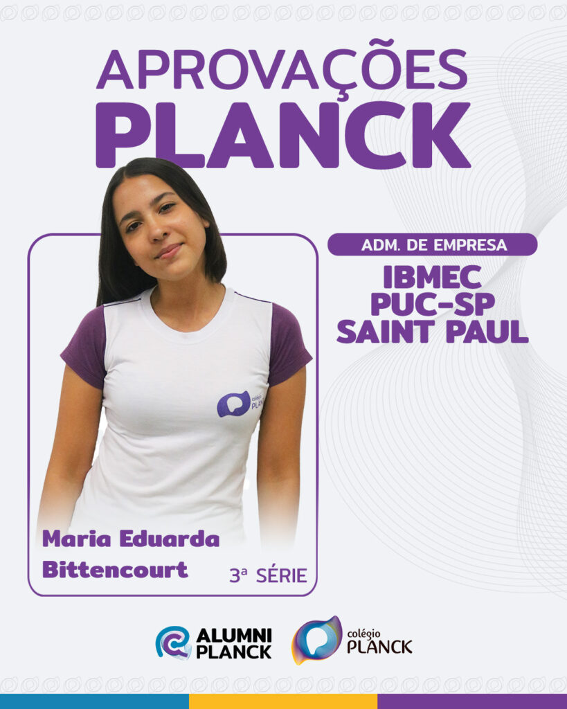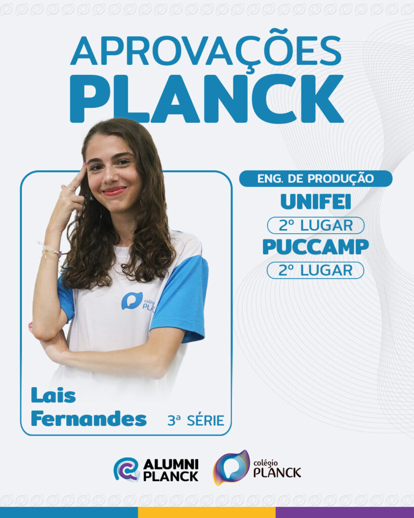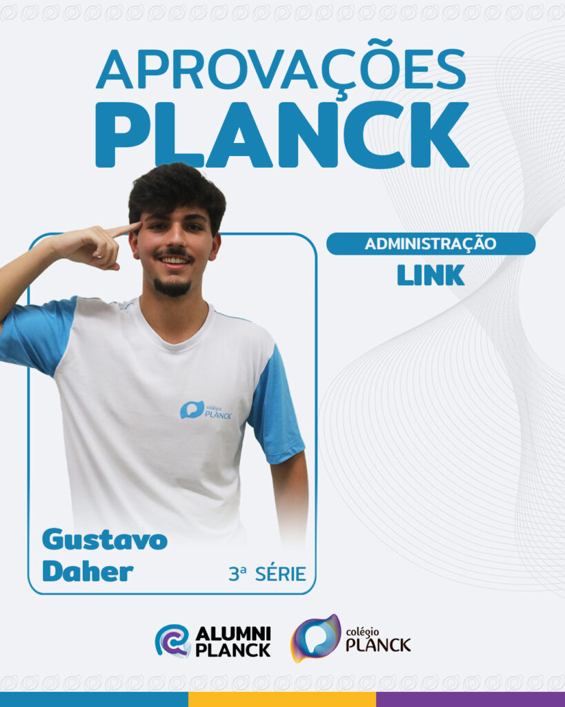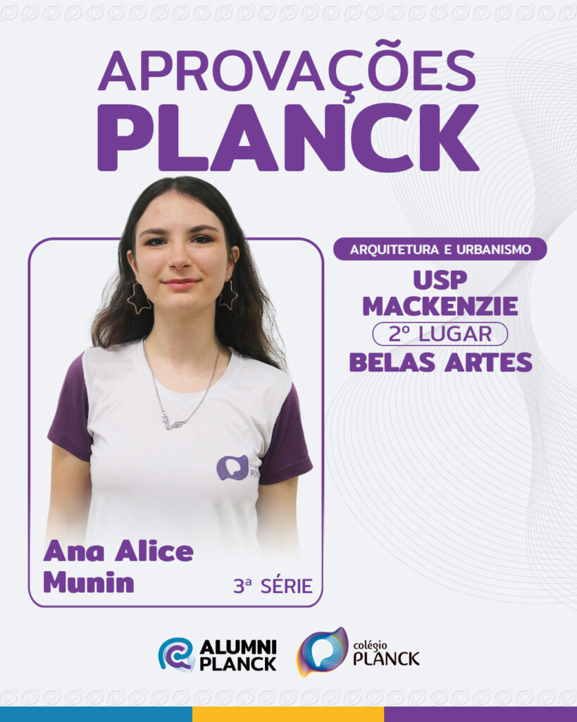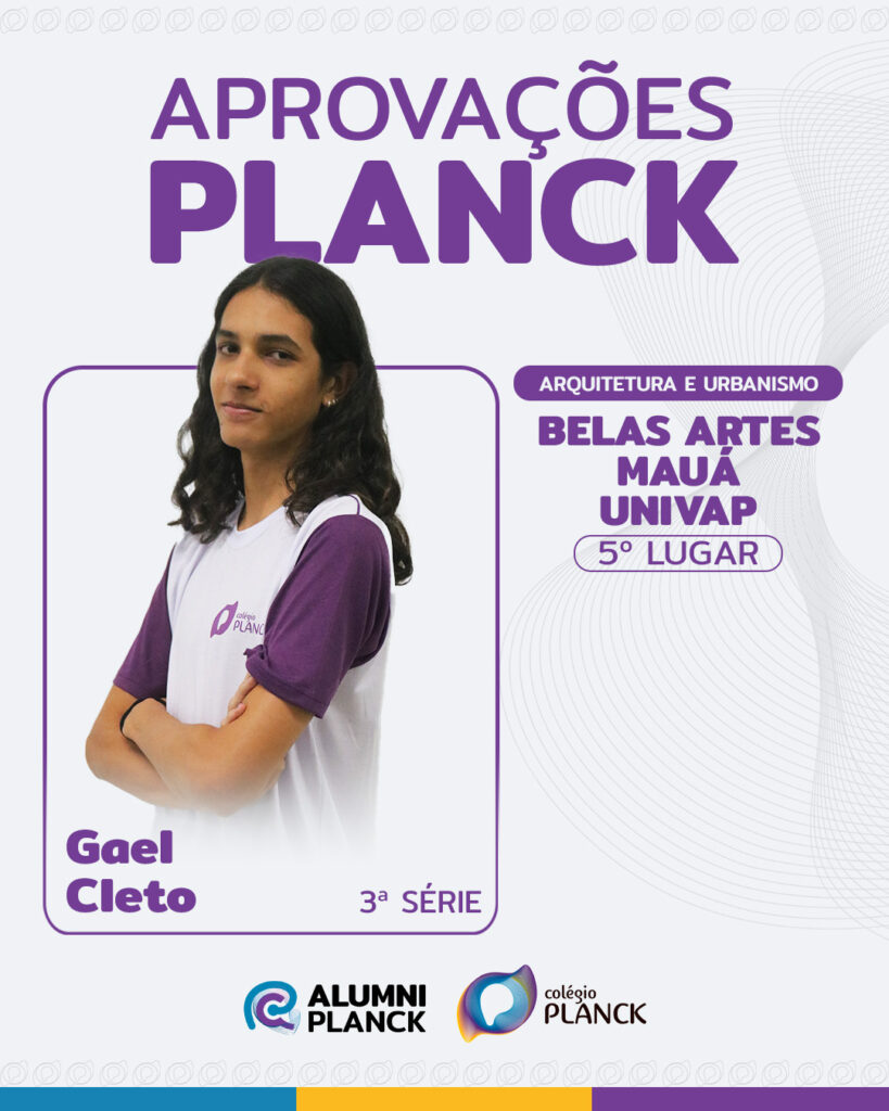 O Colégio Planck se destaca ano após ano pelos excelentes resultados em vestibulares e universidades renomadas. Nossos alunos conquistam aprovações em instituições públicas e privadas de alto nível, reflexo de um projeto pedagógico sólido, professores altamente qualificados e uma cultura de alto desempenho acadêmico. Cada aprovação representa o compromisso do Planck com a formação integral e o futuro dos seus estudantes.