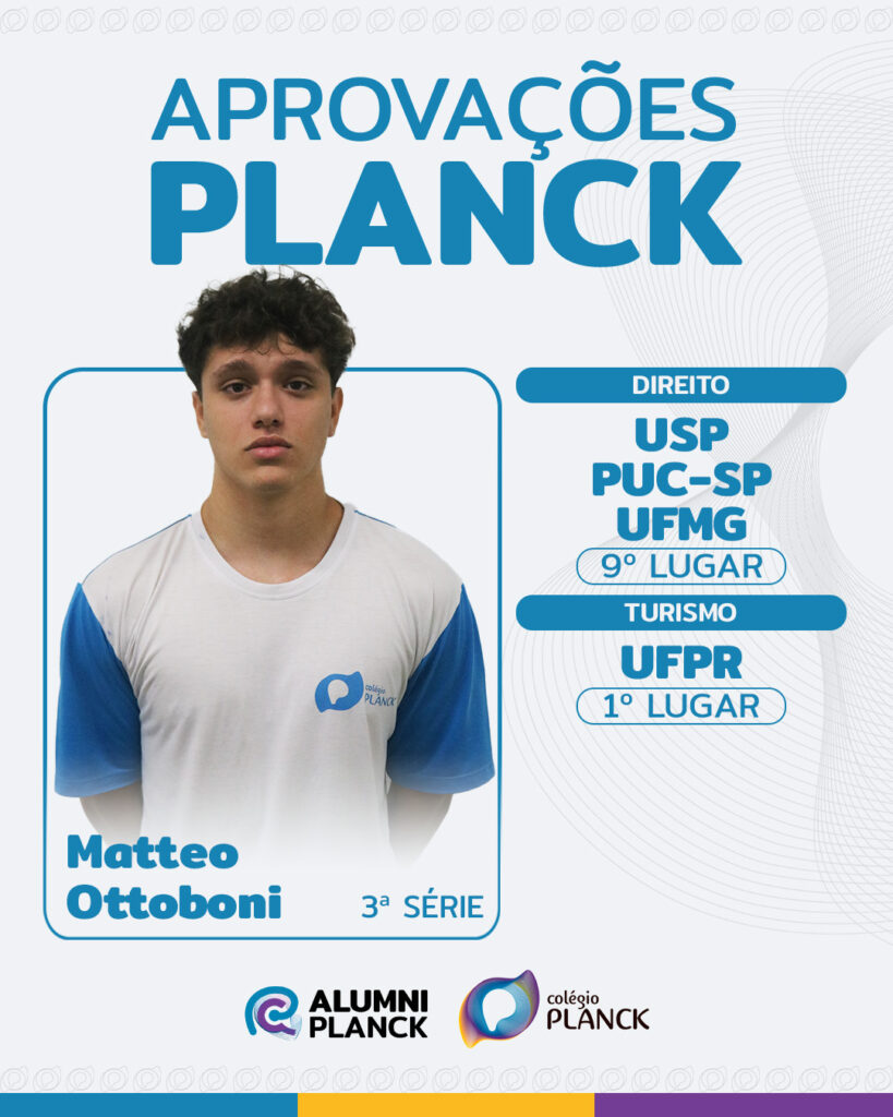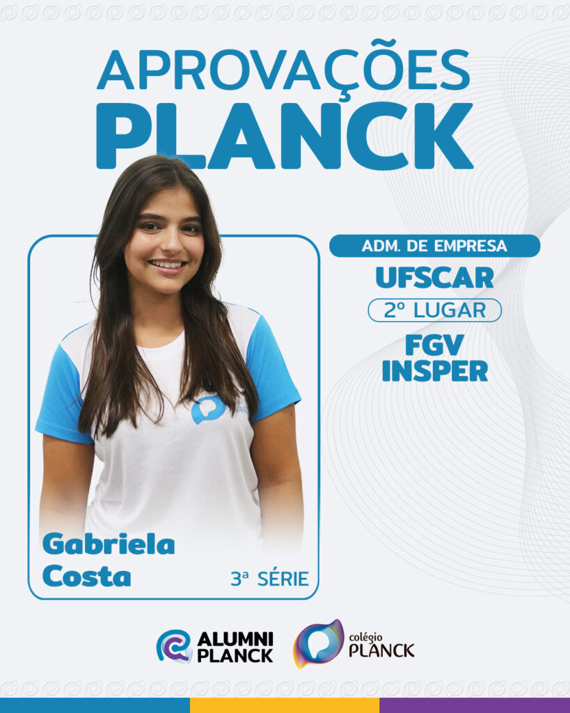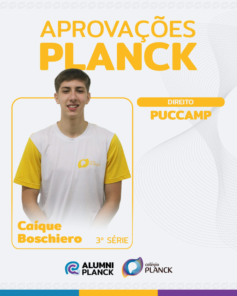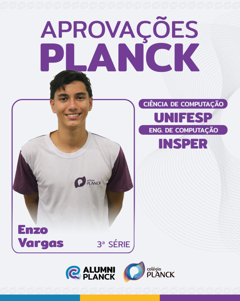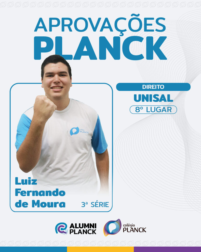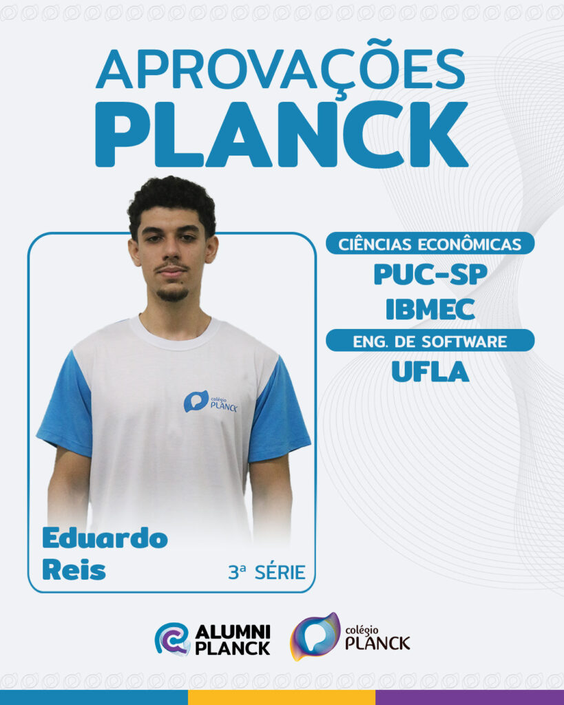 O Colégio Planck se destaca ano após ano pelos excelentes resultados em vestibulares e universidades renomadas. Nossos alunos conquistam aprovações em instituições públicas e privadas de alto nível, reflexo de um projeto pedagógico sólido, professores altamente qualificados e uma cultura de alto desempenho acadêmico. Cada aprovação representa o compromisso do Planck com a formação integral e o futuro dos seus estudantes.